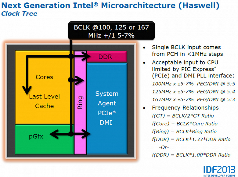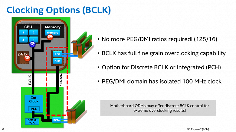 Что с разгоном по шине? В рамках LGA1155 — ничего: попытка повысить базовую частоту больше, чем на 5-7% приводила к нестабильности из-за того, что на повышенных частотах не мог функционировать контроллер PCIe. Начиная с LGA1150 эту возможность частично вернули — появился дополнительный множитель CPU Strap, повышающий частоту BCLK перед ее «подачей» к процессорным ядрам, но «не трогая» остальные части процессора. Казалось бы, все просто — оставляем частоту BCLK равной 100 МГц, устанавливаем CPU Strap в 1,25 и получаем разгон на 25%. Одна проблема — сфера применения CPU Strap не изменилась: только платы на Z87/Z97 и только процессоры с разблокированными множителями. Для покупателей последних — возможность дополнительного тюнинга, иногда позволяющего достичь более высоких результатов. Для всех остальных — ничего: как разгона не было, так его и не появилось.